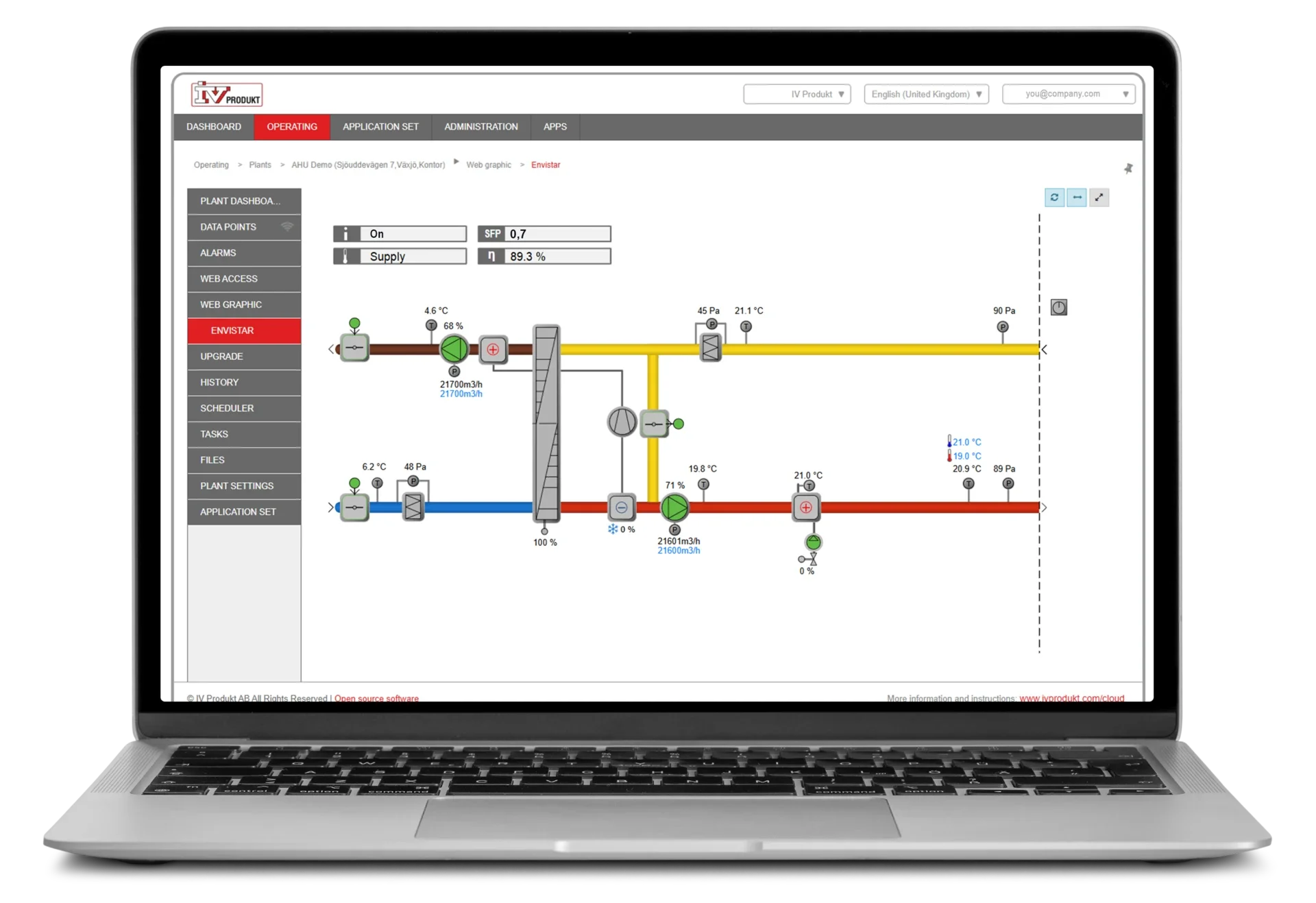 Med IV Produkt Cloud kan vi overvåge temperaturer, udføre sommer- og vinterdriftstilstande, vi optimerer driftstider og overvåger filtre med mere. Vi kan også afhjælpe 8 ud af 10 fejl eller alarmer, der kommer ind, på afstand. Det sparer os en masse tid, fordi vi ikke behøver at køre ud til alle ejendomme.