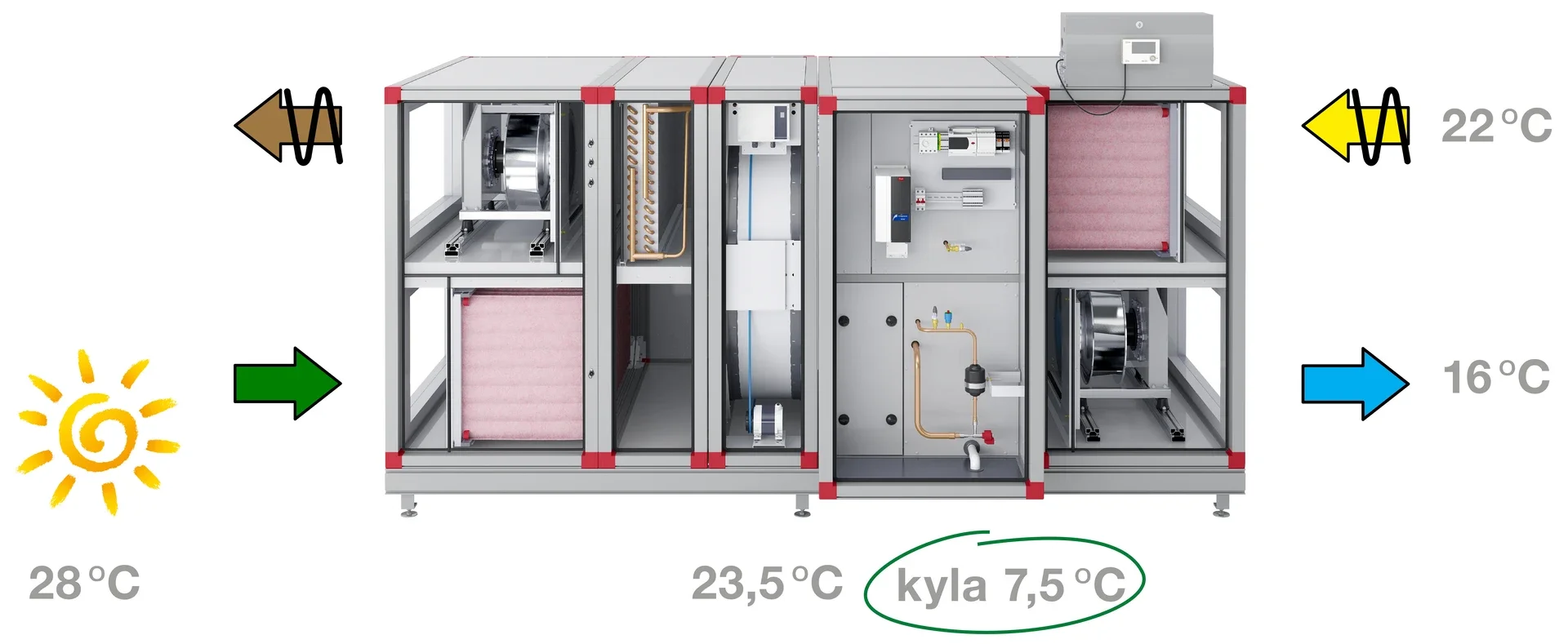 Kølemaskinen EcoCooler kan fås med en indbygget roterende varmeveksler til kølegenvinding i sekvens med kølemaskinen. På denne måde opnås en maksimal energiudnyttelse og en lav tilslutningseffekt.