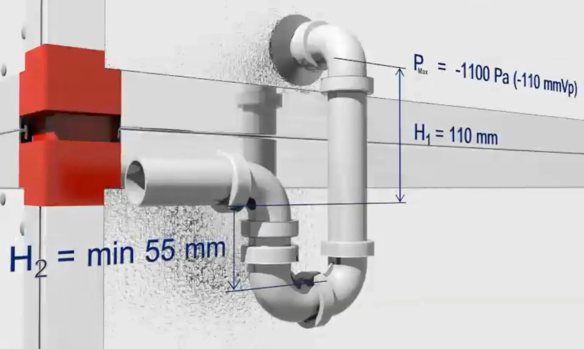 Montering af præfabrikeret MIET-CL-04, rør ø 32 mm, vandlås, undertryk (Pmax = −900 Pa) eller overtryk (Pmax = +400 Pa).