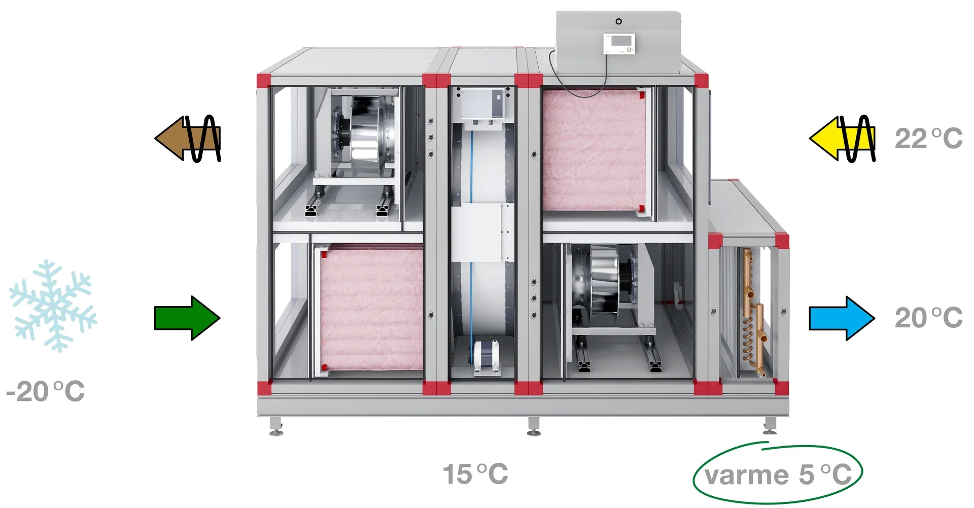Der er ofte meget varme i den luft, som skal bortventileres. Vi ønsker ikke, at denne varme skal gå til spilde, men vil derimod genvinde så meget af den som muligt. Det gør vi med forskellige slags varmevekslere. Vi genvinder altså den varme, der er i afgangsluften, til at opvarme den kolde luft, som kommer udefra.